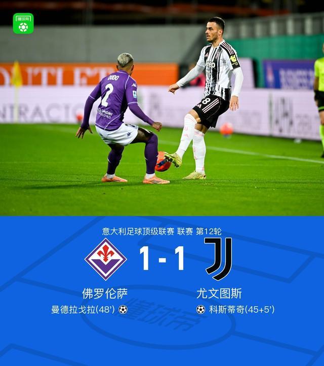 北京时间11月23日,意大利足球顶级联赛第12轮,佛罗伦萨主场迎战尤文图斯。上半场弗拉霍维奇脚后跟穿裆造点,VAR介入后裁判取消点球,补时阶段科斯蒂奇轰出世界波。下半场曼德拉戈拉世界波破旧主。最终尤文客场1-1佛罗伦萨遭遇3连平。